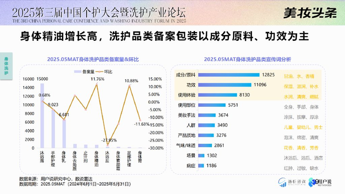 身体洗护市场体量虽不及头发洗护,却更具增长活力,各个类目均实现有效的环比增长。从平台来看,天猫淘宝、京东、拼多多、快手四大平台身体洗护总规模约401亿,天猫淘宝以202亿占比过半,实现3%微增;京东则以95.07亿体量同比高增43.68%。 从品类侧重来看,不同电商平台呈现出截然不同的销售特征与增长动能: 淘宝/天猫:头发洗护市场总体销售额居首位,护发产品有增长趋势,男士头皮护理产品增长达63%。值得注意的是,香发喷雾品类逆势增长1212%,“以发香代香水”的需求爆发,成为新增长点。 “这意味着消费者正倾向于用各种香型产品去替代香水,这是一个新机会。”林恺澌表示。 京东:通过大力扶持美妆个护品类,实现头发洗护市场65%的高增长,规模突破110亿元。其中干发喷雾类目增速惊人,达62644%,反映即时护理需求的崛起。 更为重要的是,京东的头发洗护和身体洗护均实现正增长,市场潜力仍有待挖掘。京东主要是通过引入大众品牌,叠加平台补贴,吸引更广泛人群,后来越来越多的国货新锐品牌入驻,形成“大众需求+新锐品牌”的增长闭环。 抖音:则以男士美发护发品类表现突出,同比增长184%,这表明即使染发、烫发、头发造型以及男士美发护发等市场规模仍较小,但具有很大的发展潜力,同时显示抖音在垂直人群与内容营销方面的渠道优势。 拼多多以沐浴露为销冠,契合高性价比需求;快手则身体乳霜/精油破圈,平台特色显著。 平台分化的本质,是消费需求的“渠道适配”。根据这几大主流电商平台的差异化表现,林恺澌建议品牌需采取平台定制化策略,根据平台的品类流量去做不同的策略,合理分配资源,实现精准触达。 02 品类新分野: 从“泛需求”到“精细化”的赛道演变 精细化浪潮下,头发与身体洗护赛道均涌现“小而美”的细分机会。林恺澌表示,千亿级个护市场正在朝着精细化的赛道转变。 品类结构上,头发洗护仍以“洗发为主(64%)、护理为辅(34%)”,头发&头皮洗护备案总数近4万,其中预洗、护发喷雾、生发精华同比增长快。 身体洗护则呈现“护理为主、清洁为辅”的鲜明特征,护理产品需求超过沐浴露等清洁类,消费重心向“养护”转移。 赛道细分的趋势集中在功能升级、人群细分、场景适配、局部需求。 当前产品宣传聚焦“成分”与“功能升级”,如身体洗护品类备案包装以成分原料、功效为主,2025.05MAT宣传词数量达12825。 值得注意的是,今年众多品牌都将目光瞄准了一个特定品类——身体精油。”林恺澌指出,2025.05MAT身体精油的环比增长11.76%,备案量超15000件,这表明大家对该领域充满信心,预计未来会有很多创新产品进入市场。