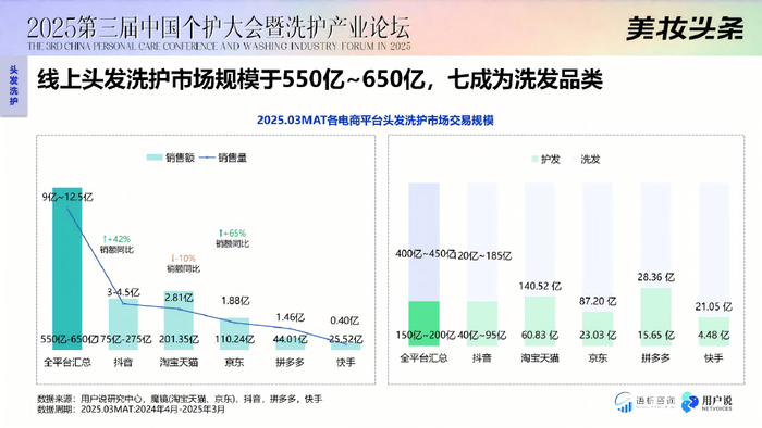 这种“功效+情绪”的双向需求,推动着行业从“泛需求覆盖”向“精准服务提供”转型。 从过去“一瓶通洗”的粗放模式,逐步转向头皮护理、手部洗护、男士专用、身体清洁等细分赛道,个护行业正式步入精细化、场景化、情绪化的新阶段。 那么,个护行业的新阶段呈现出怎样的趋势?又有哪些新品类涌现?各平台都有哪些趋向特点呢? 会上,林恺澌就《精细化浪潮:从头皮到身体的个护增长新机遇》主题,详尽解读了2025年线上头发与身体清洁护理市场趋势,不仅清晰勾勒出个护行业革新的清晰轨迹,更指出了精细化时代的特征信号:品类赛道裂变、平台格局分化、产品创新聚焦精准需求。 这三个信号都指向品牌增长的新机遇。 01 平台格局分化:品类侧重差异明显 2025年线上个护市场呈现“头发洗护基本盘稳固,身体洗护增长爆发”的特征,其中平台侧重表现与消费偏好的变化,成为这一趋势的核心推手。 头发洗护仍是个护市场的核心板块,抖音、京东、淘宝天猫、拼多多、快手5大线上平台整体体量稳定在550-650亿元区间,但平台分化显著:抖音以175亿-275亿元成为销售王者,京东凭借65%增幅展现稳健力,销售额为110.24亿元,拼多多、快手同步向好;而天猫淘宝同比下滑10%,传统电商流量红利向新渠道转移。