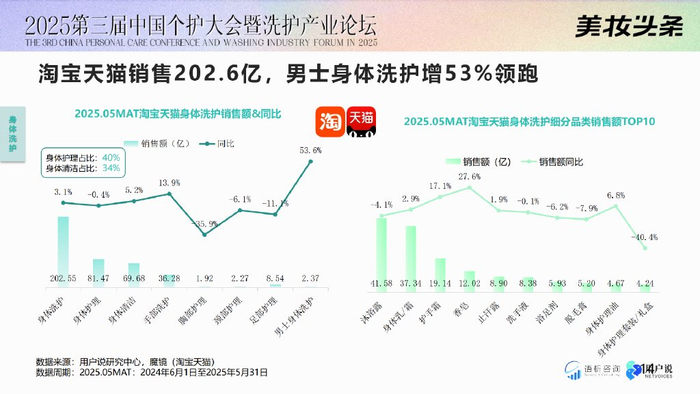 令人意外的是香皂品类也有所增长。这个一度被视为“淘汰品”的品类,在抖音实现增长21.6%、天猫淘宝同步增长。 林恺澌表示,“这说明香皂品类仍然拥有一定的消费群体,且复购率高,因此不必过于着急放弃这个(香皂)市场。” 更关键的是,“人群标签”崛起,儿童、婴幼儿、男士、中老年专属产品增多,市场从“泛成人需求”转向“人群精准服务”。 例如男士洗护。“男士市场已经被从整个洗护市场中单拎出来,无论是身体沐浴露、身体护理产品,还是局部护理产品,都是同比增长的。”林恺澌分析道,整体而言,男士身体洗护品类实现了53%的同比增长,男性专属需求崛起。