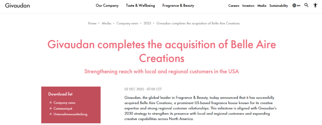国际香精香料原料商——奇华顿也于本周宣布加码香氛品牌,据其官网发布的新闻稿显示,其已完成对美国知名香氛品牌Belle Aire Creations的收购,旨在加强美国本地和区域客户的覆盖范围,以及在北美扩展创意能力。