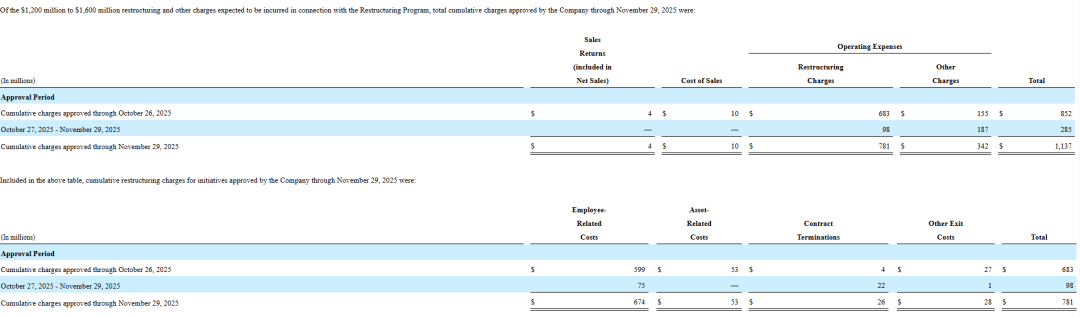 在最新的财务更新中,据官网的监管文件显示,自重组计划启动至2025年11月29日期间批准的相关举措的累计重组及税前费用约11.37亿美元(约合人民币80.31亿元)。