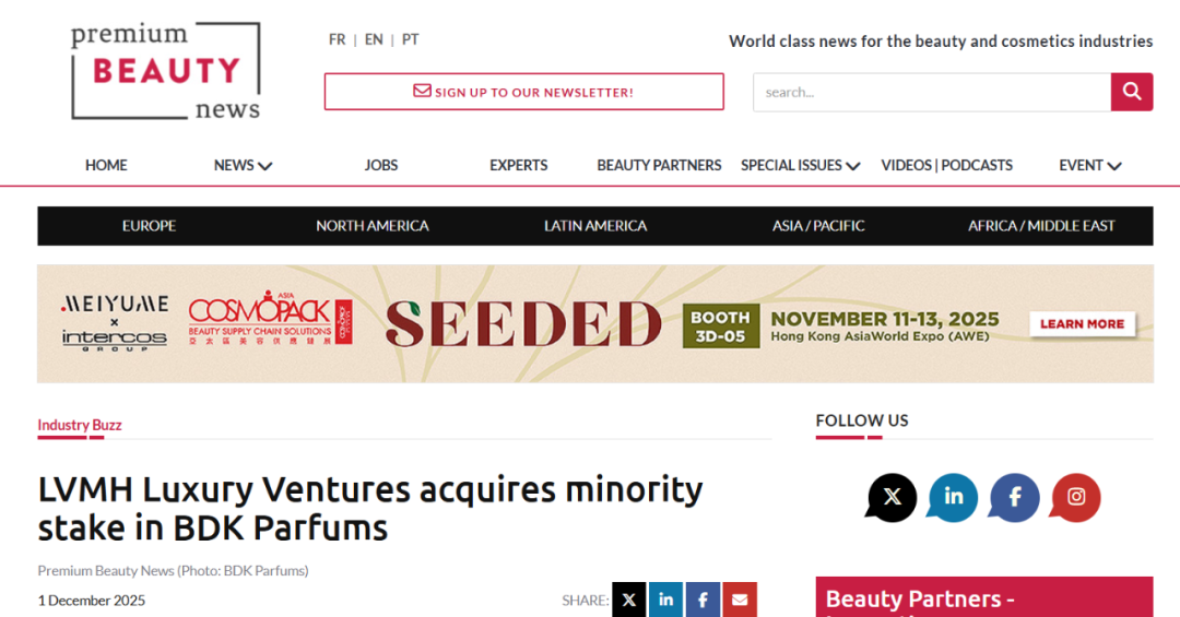 时至今日,香水热度依然高涨,其中小众香水品牌成为巨头青睐的对象。日前(12月1日),据外媒premium beauty news相关报道显示,LVMH奢华风险投资基金已持有法国小众香氛品牌BDK Parfums的少数股权,交易的财务条款未被披露。